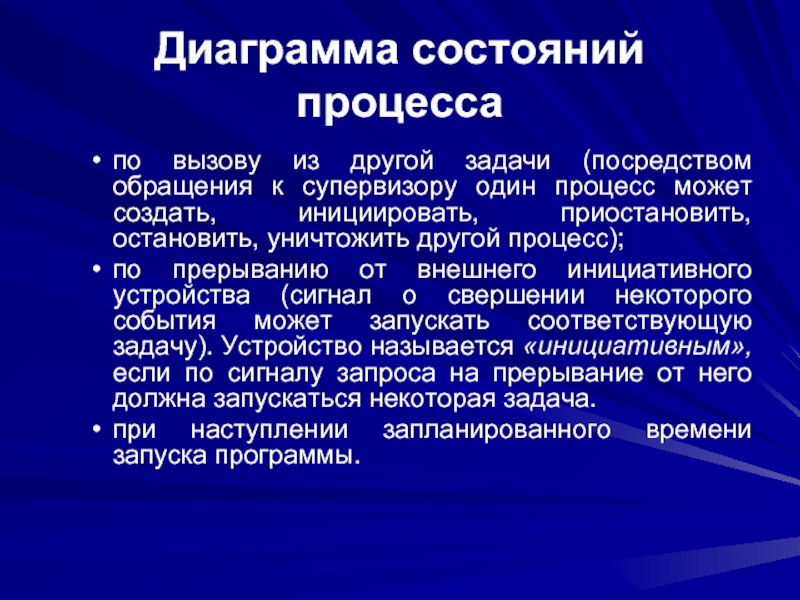 по прерыванию от внешнего инициативного устройства (сигнал о свершении некоторого события может запускать соответствующую задачу). Устройство называется «инициативным», если по сигналу запроса на прерывание от него должна запускаться некоторая задача.