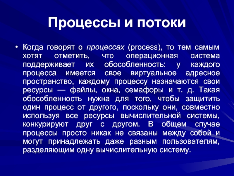 отметить, что операционная система поддерживает их обособленность: у каждого процесса имеется свое виртуальное адресное пространство, каждому процессу назначаются свои ресурсы — файлы, окна, семафоры и т. д. Такая обособленность нужна для того, чтобы защитить один процесс от другого, поскольку они, совместно используя все ресурсы вычислительной системы, конкурируют друг с другом. В общем случае процессы просто никак не связаны между собой и могут принадлежать даже разным пользователям, разделяющим одну вычислительную систему.
