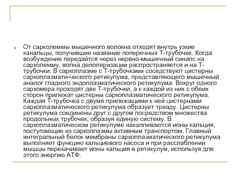 Т-трубочек. Когда возбуждение передаётся через нервно-мышечный синапс на сарколемму, волна деполяризации распространяется и на Т-трубочки. В саркоплазме с Т-трубочками соседствуют цистерны саркоплазматического ретикулума, представляющего мышечный аналог гладкого эндоплазматического ретикулума. Вокруг одного саркомера проходят две Т-трубочки, а к каждой из них с обеих сторон прилежат цистерны саркоплазматического ретикулума. Каждая Т-трубочка с двумя прилежащими к ней цистернами саркоплазматического ретикулума образует триаду. Цистерны ретикулума соединены друг с другом посредством множества продольных трубочек, образуя единую систему. В саркоплазматическом ретикулуме накапливаются ионы кальция, поступающие из саркоплазмы активным транспортом. Главный интегральный белок мембраны саркоплазматического ретикулума выполняет функцию кальциевого насоса и при расслаблении мышцы перекачивает ионы кальция в ретикулум, используя для этого энергию АТФ.