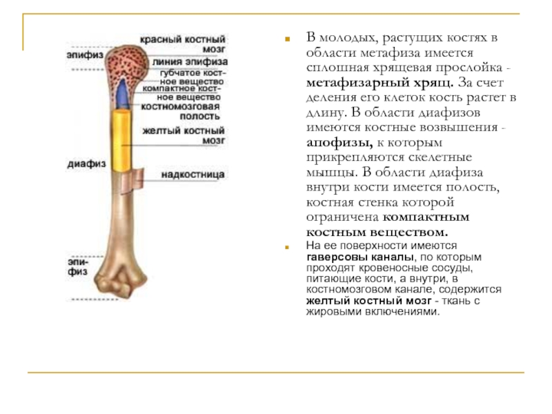 - метафизарный хрящ. За счет деления его клеток кость растет в длину. В области диафизов имеются костные возвышения - апофизы, к которым прикрепляются скелетные мышцы. В области диафиза внутри кости имеется полость, костная стенка которой ограничена компактным костным веществом.