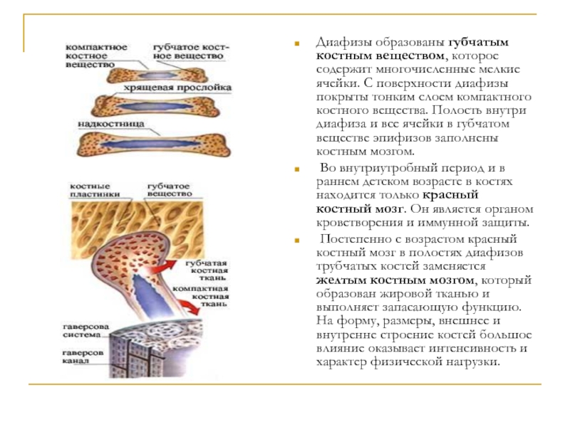 Постепенно с возрастом красный костный мозг в полостях диафизов трубчатых костей заменяется желтым костным мозгом, который образован жировой тканью и выполняет запасающую функцию. На форму, размеры, внешнее и внутренне строение костей большое влияние оказывает интенсивность и характер физической нагрузки.