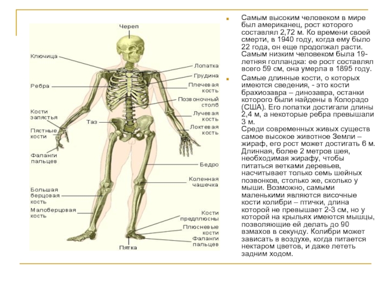 м. Ко времени своей смерти, в 1940 году, когда ему было 22 года, он еще продолжал расти. Самым низким человеком была 19-летняя голландка: ее рост составлял всего 59 см, она умерла в 1895 году.
