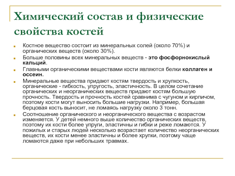 Минеральные вещества придают костям твердость и хрупкость, органические - гибкость, упругость, эластичность. В целом сочетание органических и неорганических веществ придают костям большую прочность. Твердость и прочность костей сравнима с чугуном и кирпичом, поэтому кости могут выносить большие нагрузки. Например, большая берцовая кость выносит, не ломаясь нагрузку около 3 тонн.