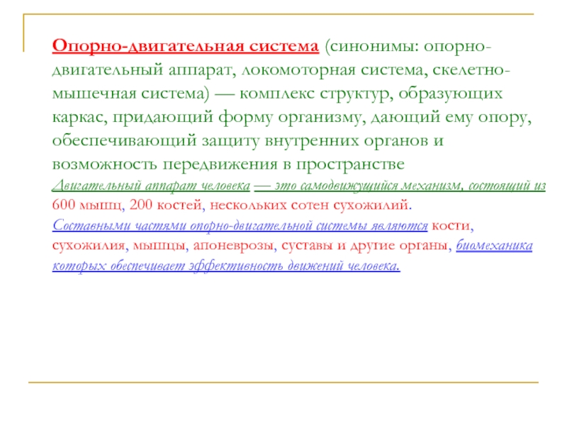 Слайд 2Опорно-двигательная система (синонимы: опорно-двигательный аппарат, локомоторная система, скелетно-мышечная система) — комплекс