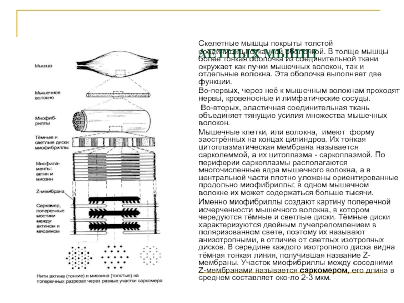 - актина и миозина. Более тонкие нити актина одним концом прикрепляются к Z-мембране. К этой же мембране с другой стороны прикрепляются, как щетинки к щётке, актиновые нити соседнего саркомера. В промежутки между актиновыми нитями примерно на 1/4 их длины входят толстые нити второго сократительного белка - миозина. Участки миофибриллы, содержащие миозин, соответствуют тёмным анизотропным дискам, а актин - светлым изотропным дискам. Мышечное сокращение осуществляется с помощью специального механизма втягивания тонких нитей актина в центр саркомера между толстыми нитями миозина. При сокращении уменьшается только длина саркомеров, тогда как длина актиновых и миозиновых нитей не изменяется.