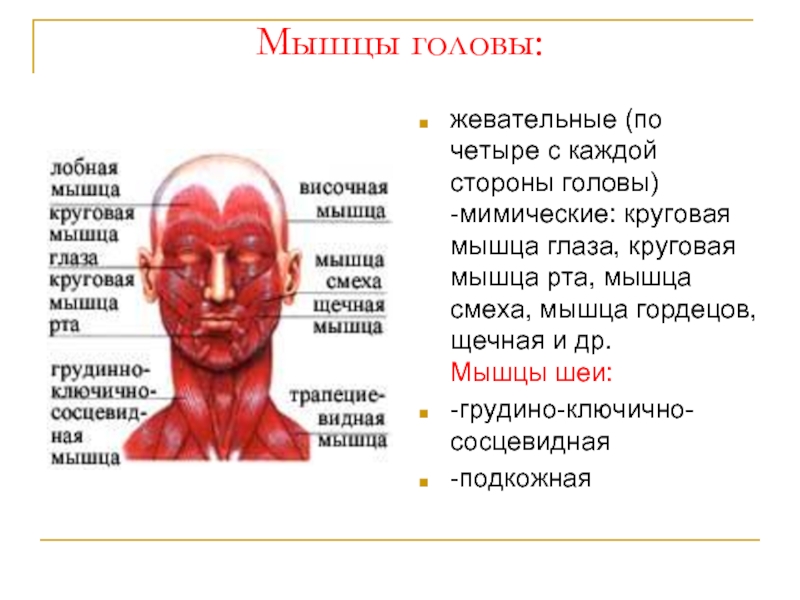 круговая мышца рта, мышца смеха, мышца гордецов, щечная и др.