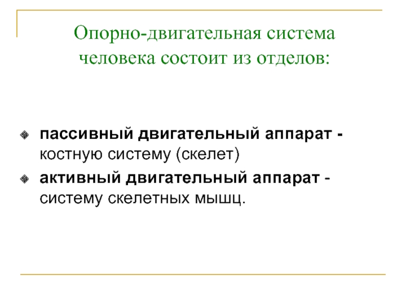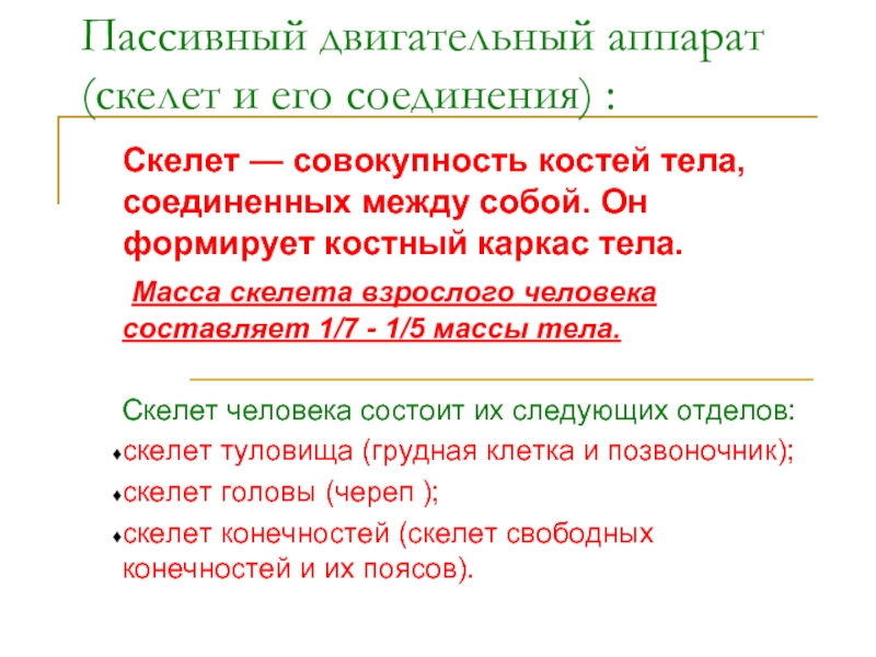 Слайд 6Пассивный двигательный аппарат (скелет и его соединения) :