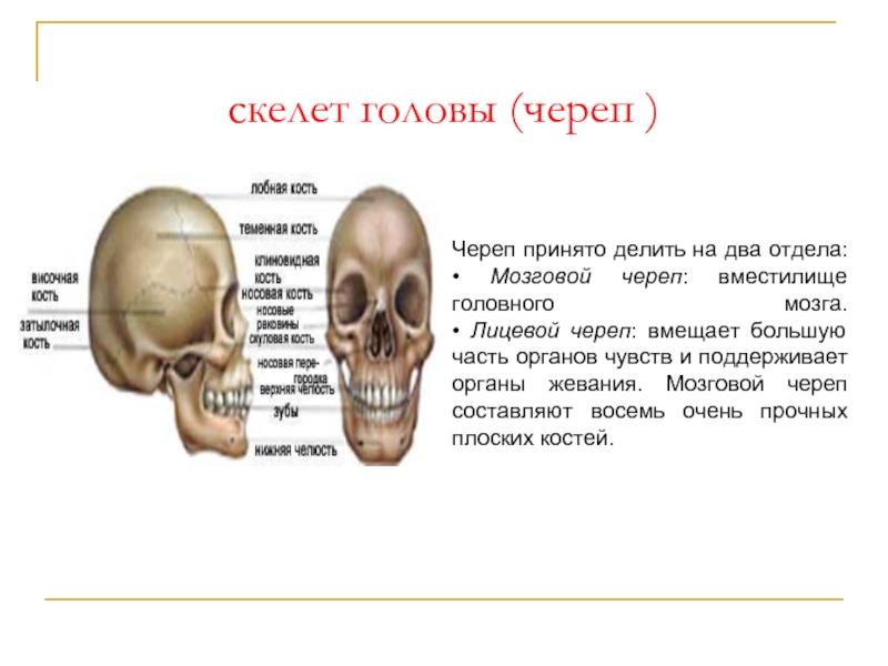 • Лицевой череп: вмещает большую часть органов чувств и поддерживает органы жевания. Мозговой череп составляют восемь очень прочных плоских костей.
