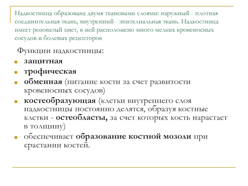 Слайд 13Надкостница образована двумя тканевыми слоями: наружный - плотная соединительная ткань, внутренний