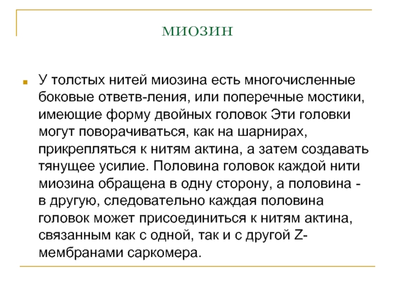 имеющие форму двойных головок Эти головки могут поворачиваться, как на шарнирах, прикрепляться к нитям актина, а затем создавать тянущее усилие. Половина головок каждой нити миозина обращена в одну сторону, а половина - в другую, следовательно каждая половина головок может присоединиться к нитям актина, связанным как с одной, так и с другой Z-мембранами саркомера.