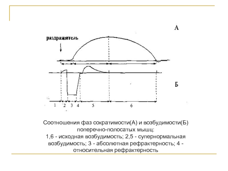 Слайд 54Соотношения фаз сократимости(А) и возбудимости(Б) поперечно-полосатых мышц: