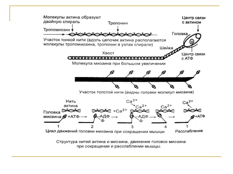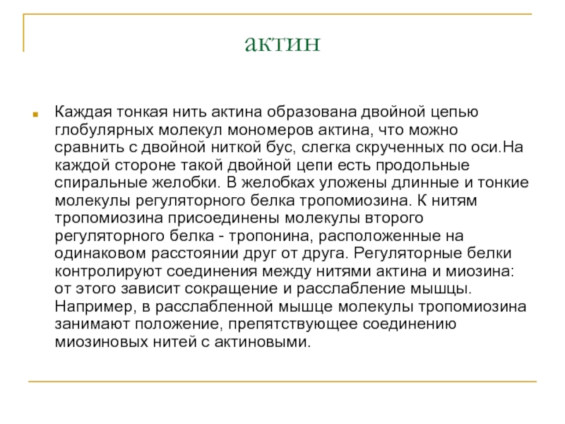 что можно сравнить с двойной ниткой бус, слегка скрученных по оси.На каждой стороне такой двойной цепи есть продольные спиральные желобки. В желобках уложены длинные и тонкие молекулы регуляторного белка тропомиозина. К нитям тропомиозина присоединены молекулы второго регуляторного белка - тропонина, расположенные на одинаковом расстоянии друг от друга. Регуляторные белки контролируют соединения между нитями актина и миозина: от этого зависит сокращение и расслабление мышцы. Например, в расслабленной мышце молекулы тропомиозина занимают положение, препятствующее соединению миозиновых нитей с актиновыми.