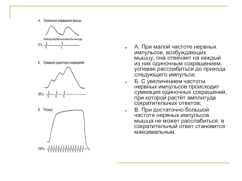 Слайд 58А. При малой частоте нервных импульсов, возбуждающих мышцу, она отвечает на