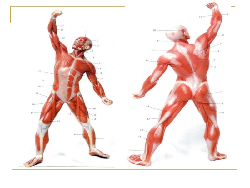 20 - наружная косая мышца живота; 21 - белая линия живота; 22 - прямая мышца живота; 23 - плечевая мышца; 24 - сгибатели предплечья; 25 - плечелучевая мышца.
