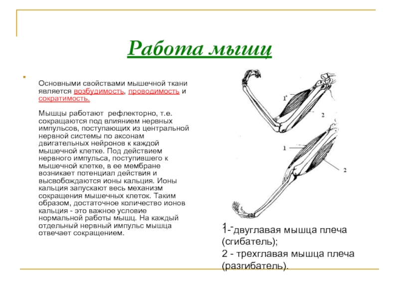 рефлекторно, т.е. сокращаются под влиянием нервных импульсов, поступающих из центральной нервной системы по аксонам двигательных нейронов к каждой мышечной клетке. Под действием нервного импульса, поступившего к мышечной клетке, в ее мембране возникает потенциал действия и высвобождаются ионы кальция. Ионы кальция запускают весь механизм сокращения мышечных клеток. Таким образом, достаточное количество ионов кальция - это важное условие нормальной работы мышц. На каждый отдельный нервный импульс мышца отвечает сокращением.