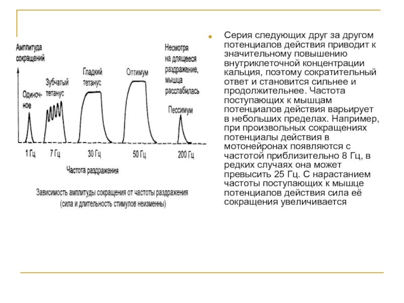 внутриклеточной концентрации кальция, поэтому сократительный ответ и становится сильнее и продолжительнее. Частота поступающих к мышцам потенциалов действия варьирует в небольших пределах. Например, при произвольных сокращениях потенциалы действия в мотонейронах появляются с частотой приблизительно 8 Гц, в редких случаях она может превысить 25 Гц. С нарастанием частоты поступающих к мышце потенциалов действия сила её сокращения увеличивается