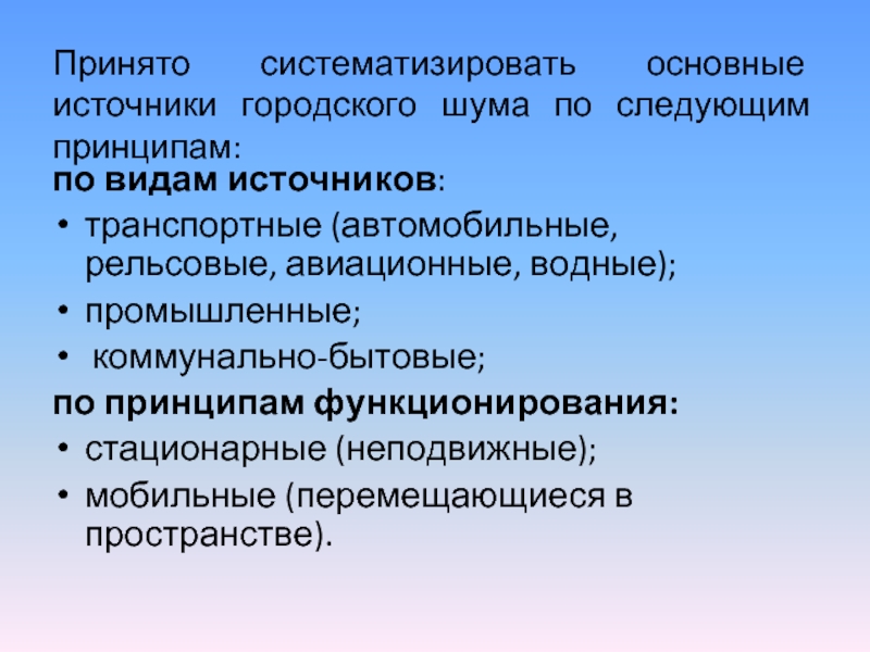 Слайд 5Принято систематизировать основные источники городского шума по следующим принципам: