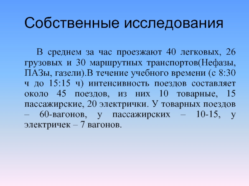 26 грузовых и 30 маршрутных транспортов(Нефазы, ПАЗы, газели).В течение учебного времени (с 8:30 ч до 15:15 ч) интенсивность поездов составляет около 45 поездов, из них 10 товарные, 15 пассажирские, 20 электрички. У товарных поездов – 60-вагонов, у пассажирских – 10-15, у электричек – 7 вагонов.