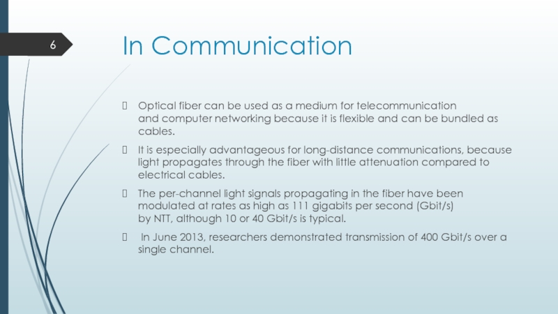 In June 2013, researchers demonstrated transmission of 400 Gbit/s over a single channel.