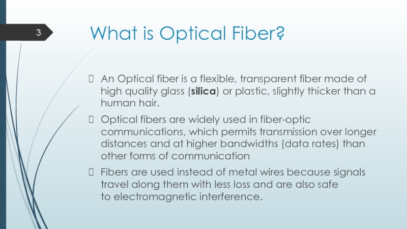 Fibers are used instead of metal wires because signals travel along them with less loss and are also safe to electromagnetic interference.