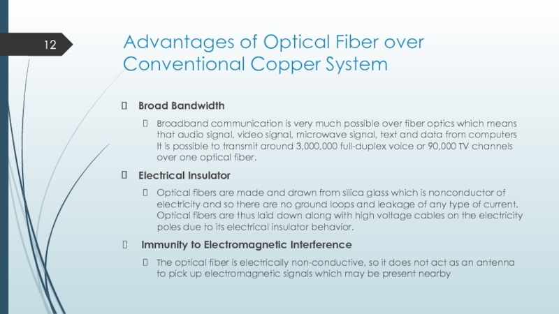 Слайд 12Advantages of Optical Fiber over Conventional Copper System