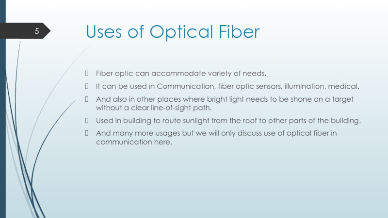 And many more usages but we will only discuss use of optical fiber in communication here.