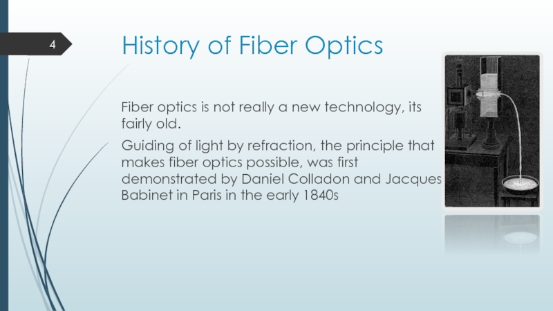 Guiding of light by refraction, the principle that makes fiber optics possible, was first demonstrated by Daniel Colladon and Jacques Babinet in Paris in the early 1840s