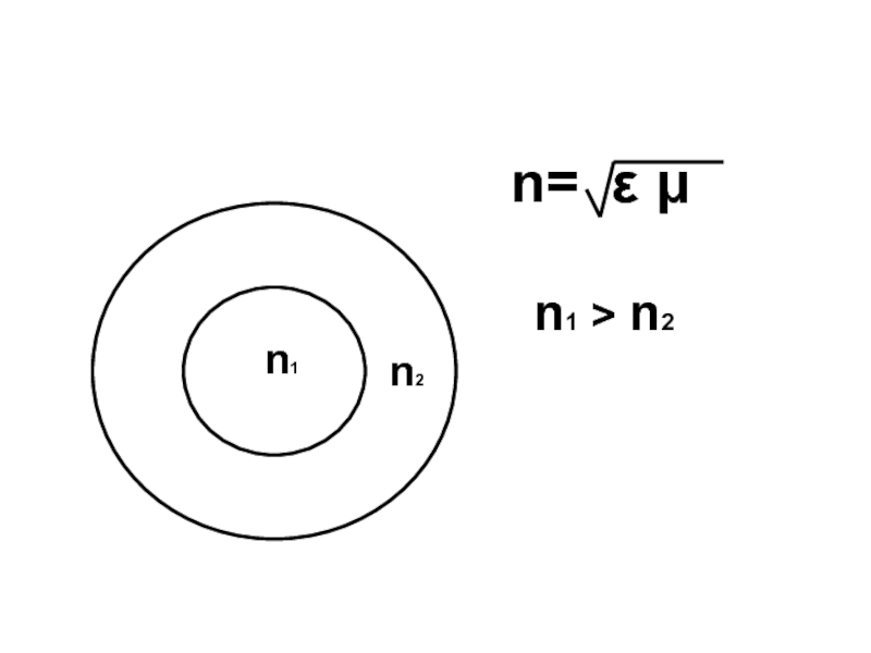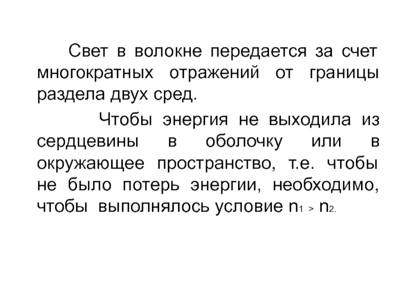 Чтобы энергия не выходила из сердцевины в оболочку или в окружающее пространство, т.е. чтобы не было потерь энергии, необходимо, чтобы выполнялось условие n1 > n2.