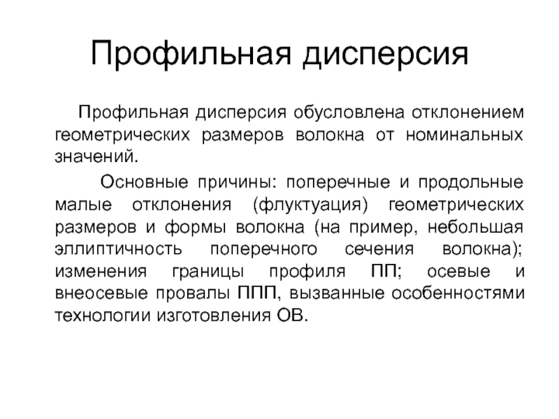 и эксплуатации ВОЛС. В ряде случаев профильная дисперсия может оказать существенное влияние на общую дисперсию. Профильная дисперсия может появляться как в многомодовых, так и в одномодовых ОВ.