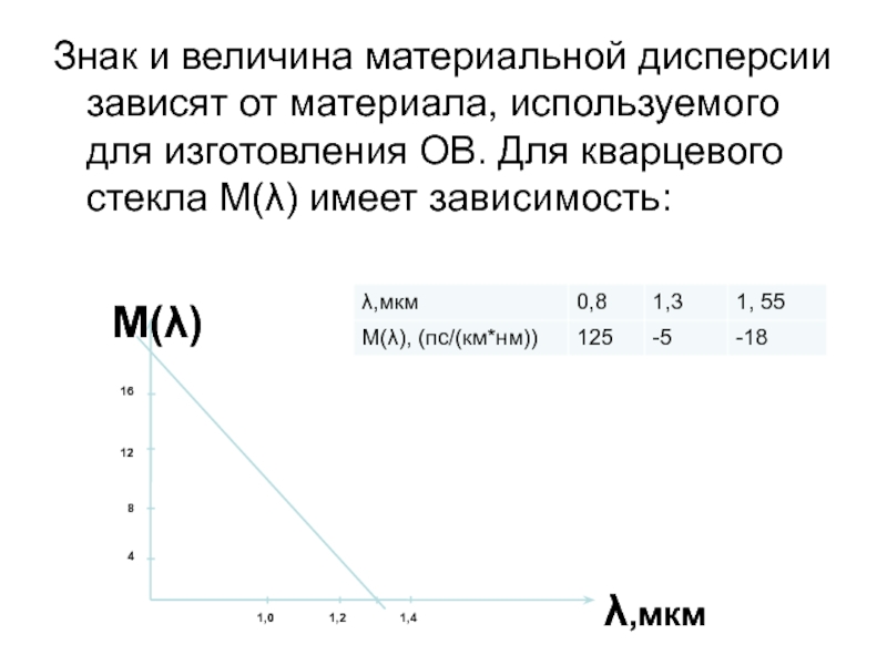 Слайд 21Знак и величина материальной дисперсии зависят от материала, используемого для изготовления