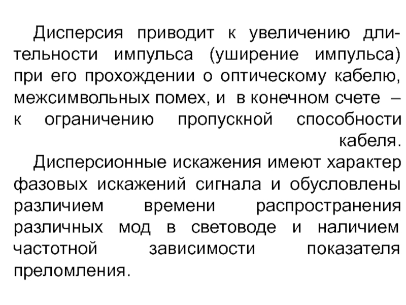 Дисперсионные искажения имеют характер фазовых искажений сигнала и обусловлены различием времени распространения различных мод в световоде и наличием частотной зависимости показателя преломления.