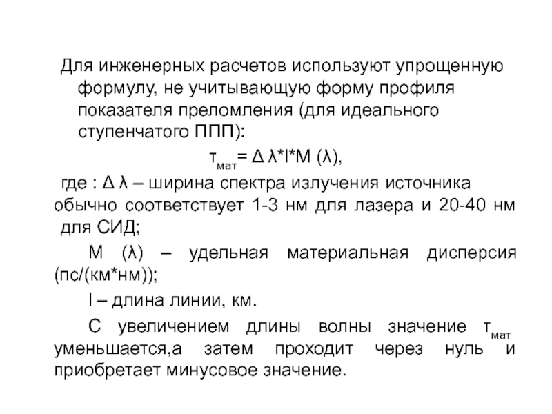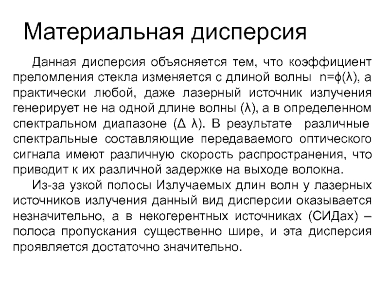длиной волны n=ϕ(λ), а практически любой, даже лазерный источник излучения генерирует не на одной длине волны (λ), а в определенном спектральном диапазоне (Δ λ). В результате различные спектральные составляющие передаваемого оптического сигнала имеют различную скорость распространения, что приводит к их различной задержке на выходе волокна.
