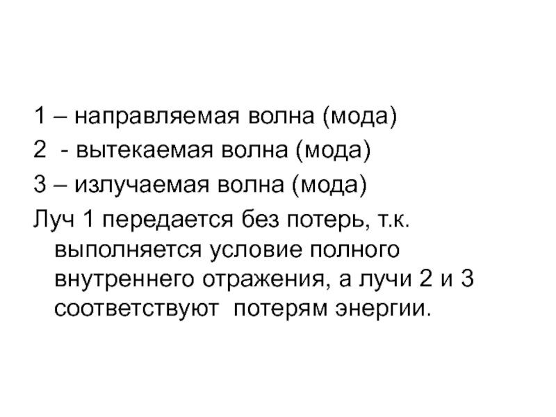 Луч 1 передается без потерь, т.к. выполняется условие полного внутреннего отражения, а лучи 2 и 3 соответствуют потерям энергии.