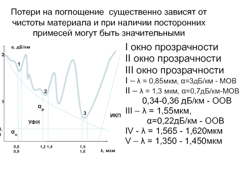 Слайд 14Потери на поглощение существенно зависят от чистоты материала и при наличии