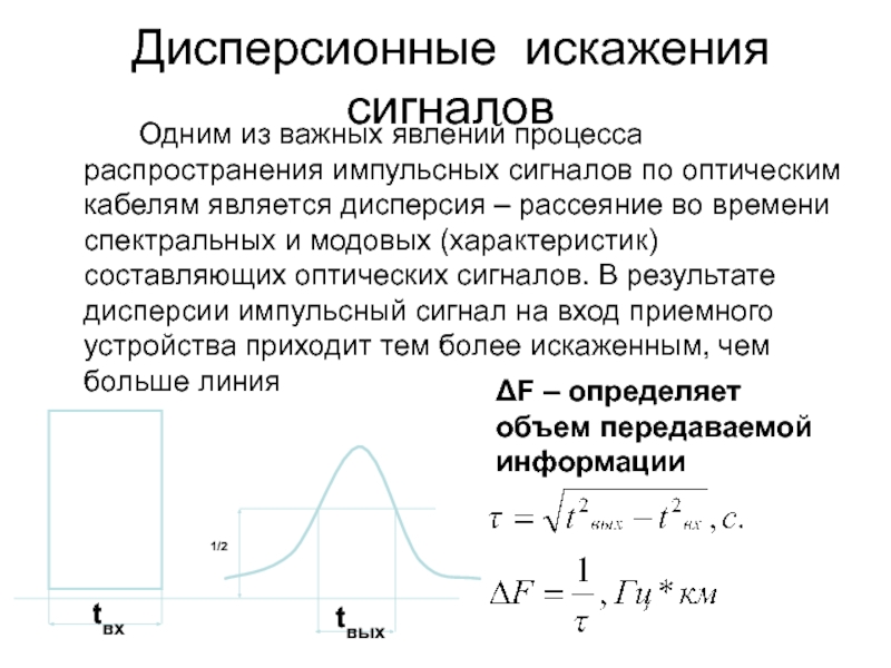 оптическим кабелям является дисперсия – рассеяние во времени спектральных и модовых (характеристик) составляющих оптических сигналов. В результате дисперсии импульсный сигнал на вход приемного устройства приходит тем более искаженным, чем больше линия