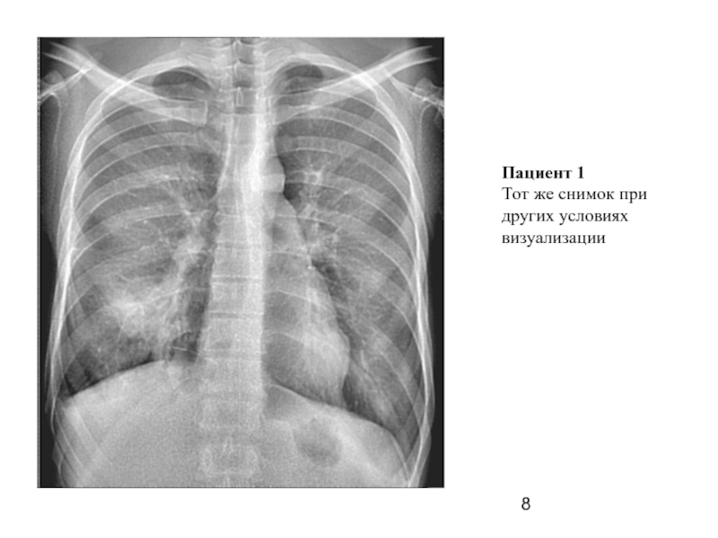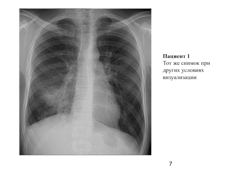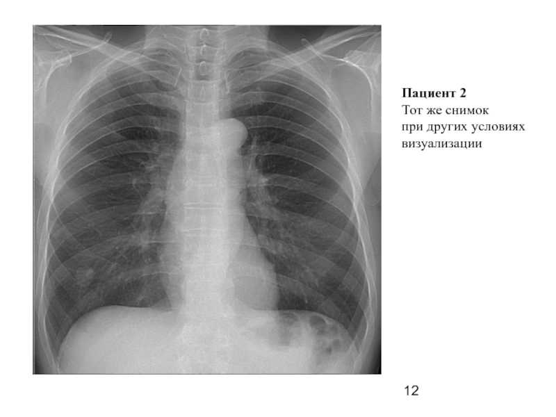 Широкий динамический диапазон. Хорошо видны легкие, виден позвоночник.