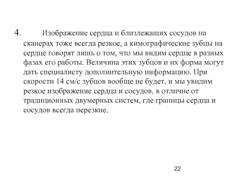сканерах тоже всегда резкое, а кимографические зубцы на сердце говорят лишь о том, что мы видим сердце в разных фазах его работы. Величина этих зубцов и их форма могут дать специалисту дополнительную информацию. При скорости 14 см/с зубцов вообще не будет, и мы увидим резкое изображение сердца и сосудов, в отличие от традиционных двумерных систем, где границы сердца и сосудов всегда нерезкие.