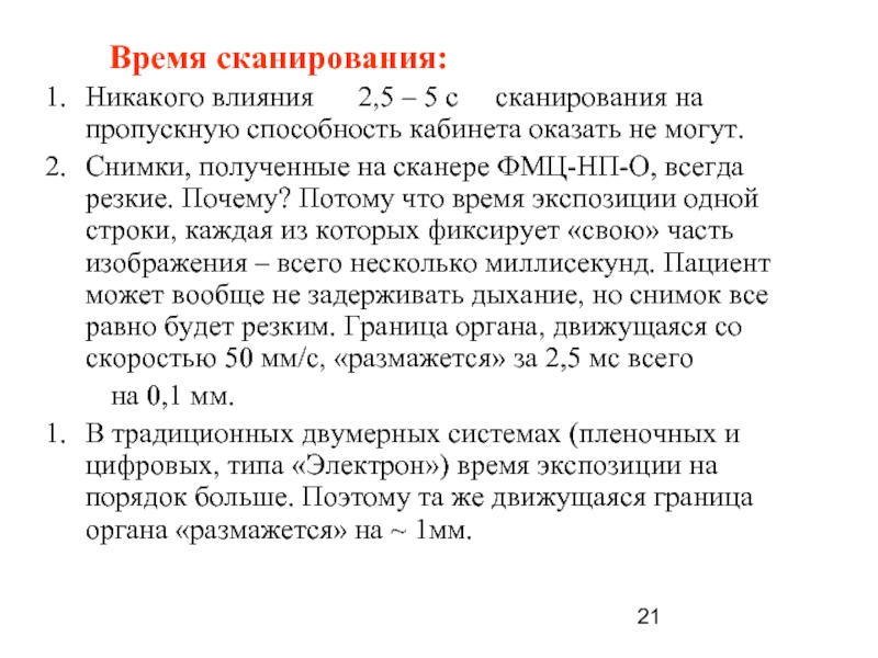 Снимки, полученные на сканере ФМЦ-НП-О, всегда резкие. Почему? Потому что время экспозиции одной строки, каждая из которых фиксирует «свою» часть изображения – всего несколько миллисекунд. Пациент может вообще не задерживать дыхание, но снимок все равно будет резким. Граница органа, движущаяся со скоростью 50 мм/c, «размажется» за 2,5 мс всего