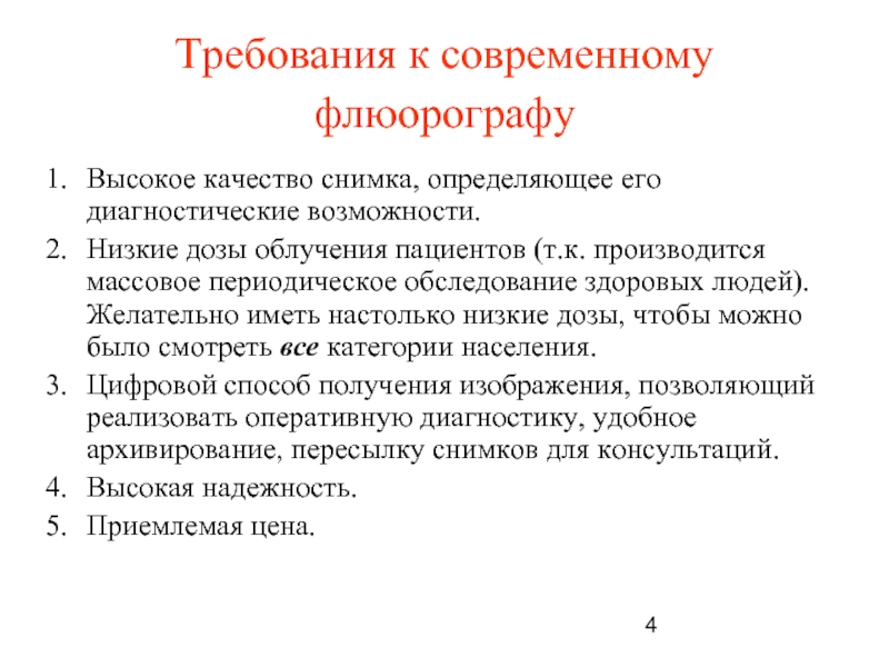 дозы облучения пациентов (т.к. производится массовое периодическое обследование здоровых людей). Желательно иметь настолько низкие дозы, чтобы можно было смотреть все категории населения.