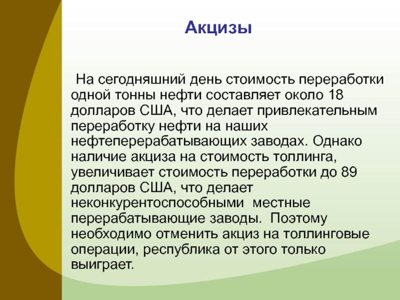 долларов США, что делает привлекательным переработку нефти на наших нефтеперерабатывающих заводах. Однако наличие акциза на стоимость толлинга, увеличивает стоимость переработки до 89 долларов США, что делает неконкурентоспособными местные перерабатывающие заводы. Поэтому необходимо отменить акциз на толлинговые операции, республика от этого только выиграет.