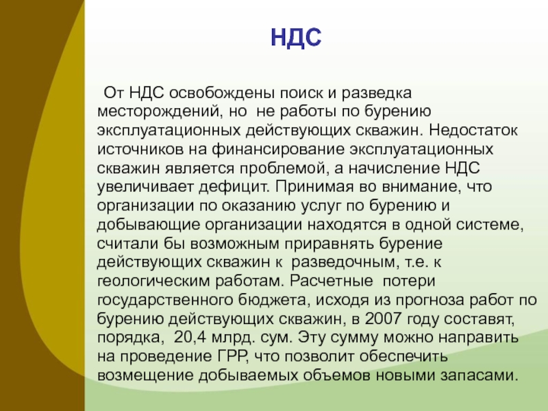 бурению эксплуатационных действующих скважин. Недостаток источников на финансирование эксплуатационных скважин является проблемой, а начисление НДС увеличивает дефицит. Принимая во внимание, что организации по оказанию услуг по бурению и добывающие организации находятся в одной системе, считали бы возможным приравнять бурение действующих скважин к разведочным, т.е. к геологическим работам. Расчетные потери государственного бюджета, исходя из прогноза работ по бурению действующих скважин, в 2007 году составят, порядка, 20,4 млрд. сум. Эту сумму можно направить на проведение ГРР, что позволит обеспечить возмещение добываемых объемов новыми запасами.