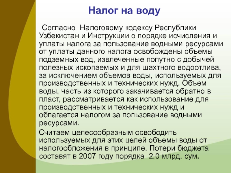 Считаем целесообразным освободить используемых для этих целей объемы воды от налогообложения в принципе. Потери бюджета составят в 2007 году порядка 2,0 млрд. сум.