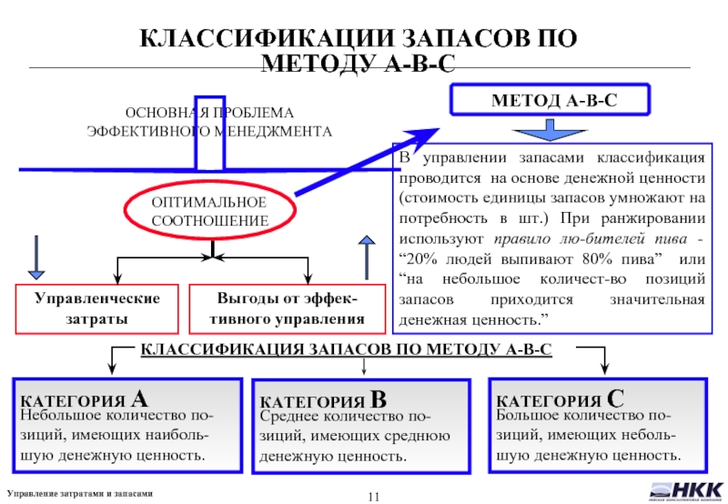 В управлении запасами классификация проводится на основе денежной ценности (стоимость единицы запасов умножают на потребность в шт.) При ранжировании используют правило лю-бителей пива - “20% людей выпивают 80% пива” или “на небольшое количест-во позиций запасов приходится значительная денежная ценность.”