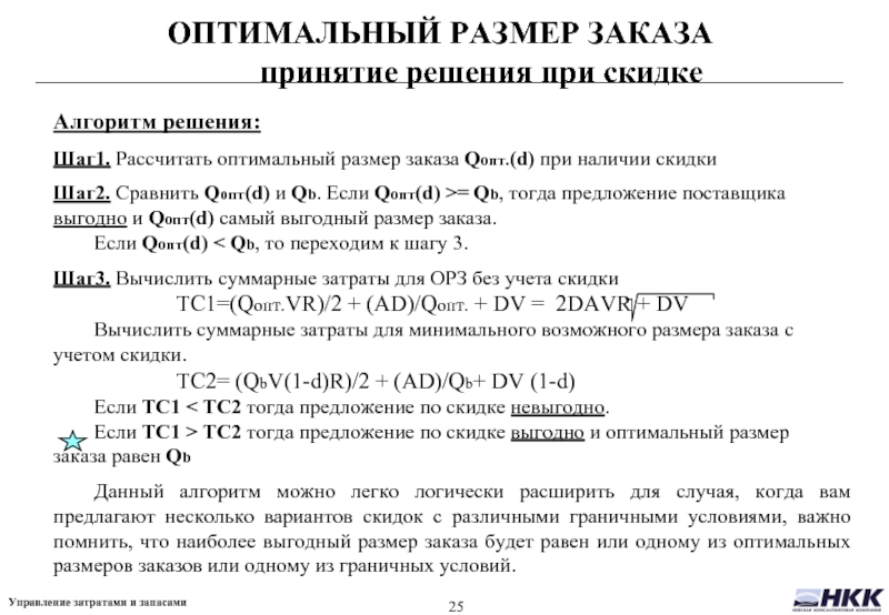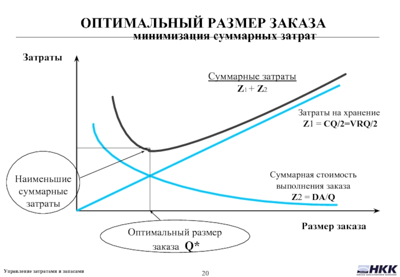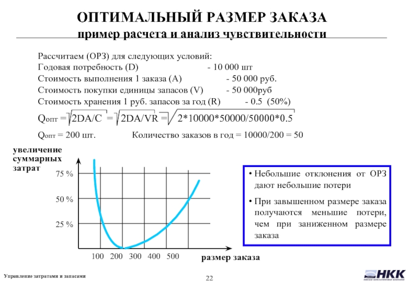 Из предыдущего слайда видно что суммарные затраты минимальны тогда, когда затраты на хранение равны затратам на выполнение заказов