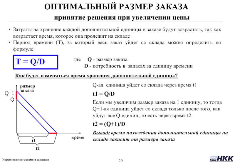 Если мы увеличим размер заказа на 1 единицу, то тогда Q+1-ая единица уйдет со склада только после того, как уйдут все Q единиц, то есть через время t2