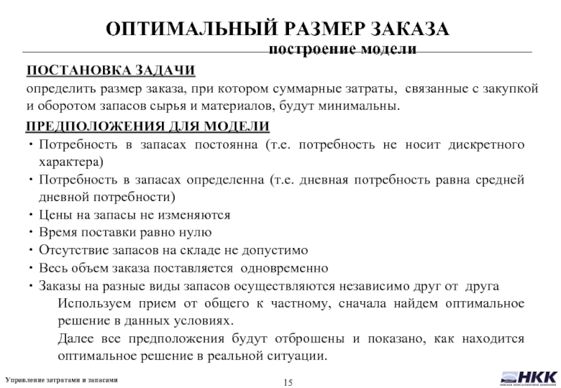 определить размер заказа, при котором суммарные затраты, связанные с закупкой и оборотом запасов сырья и материалов, будут минимальны.