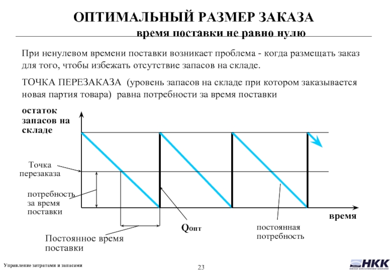 При ненулевом времени поставки возникает проблема - когда размещать заказ для того, чтобы избежать отсутствие запасов на складе.