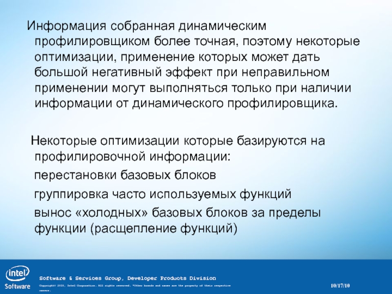 Слайд 7 Информация собранная динамическим профилировщиком более точная, поэтому некоторые оптимизации, применение
