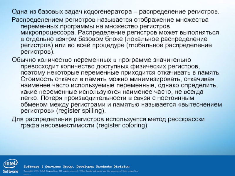 Слайд 15Одна из базовых задач кодогенератора – распределение регистров.