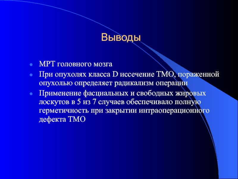 Применение фасциальных и свободных жировых лоскутов в 5 из 7 случаев обеспечивало полную герметичность при закрытии интраоперационного дефекта ТМО